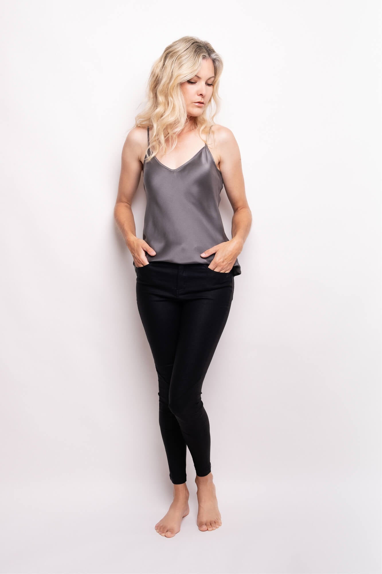Designed with versatility at its core, this 100% mulberry silk cami offers an effortless, flattering silhouette—equally refined worn alone or layered. Naturally breathable and gentle on the skin, it’s made for everyday wear, with a soft matte finish and fluid feel that bring understated elegance to any look.